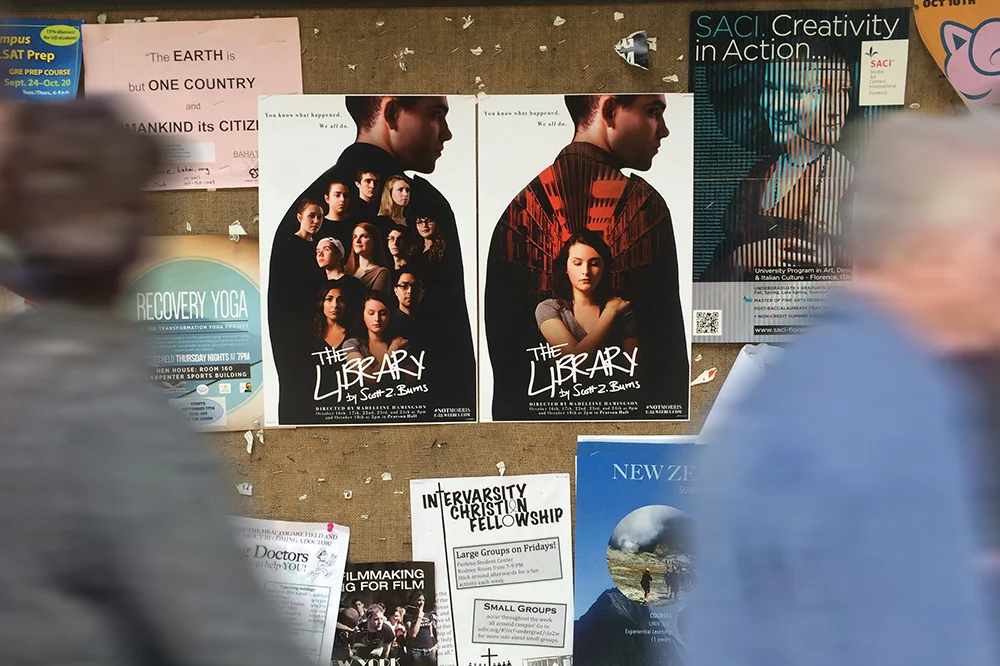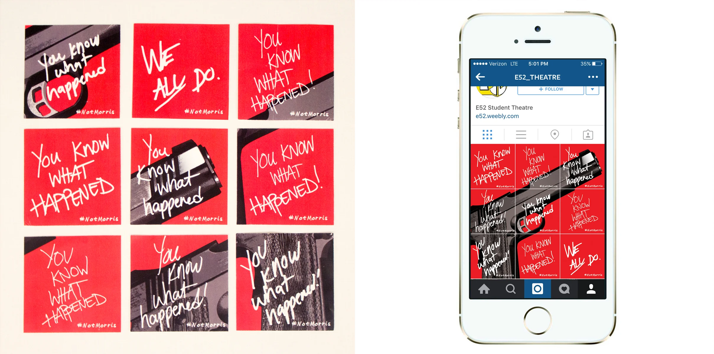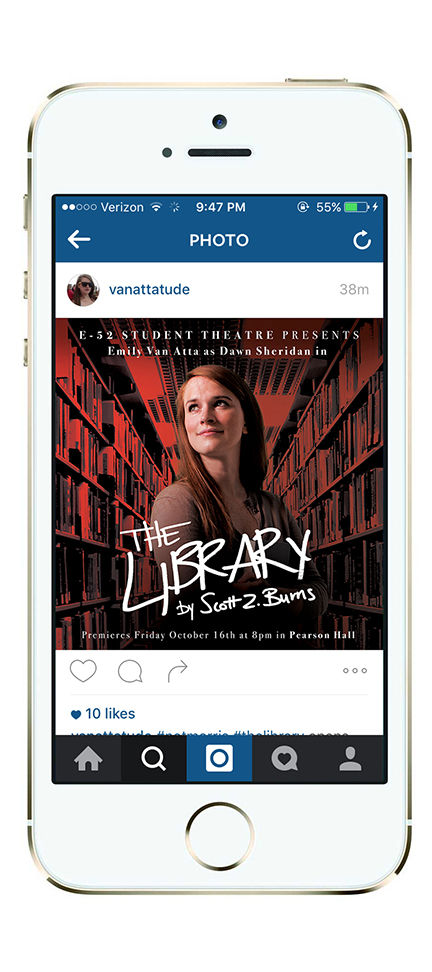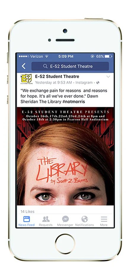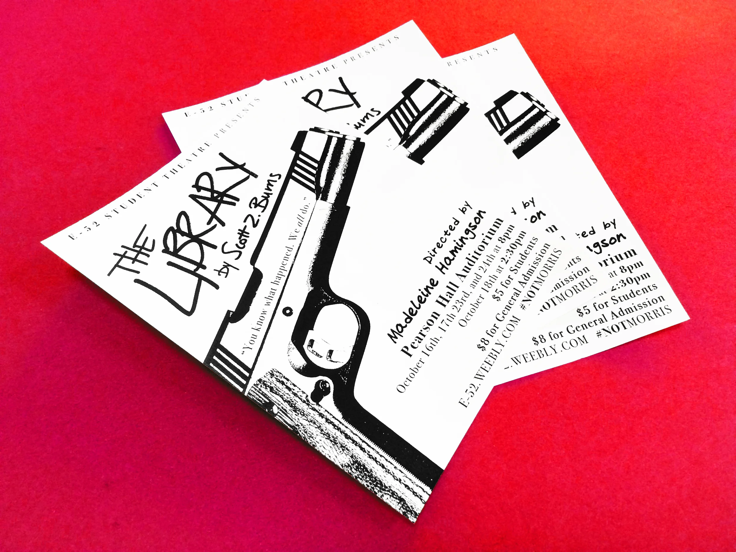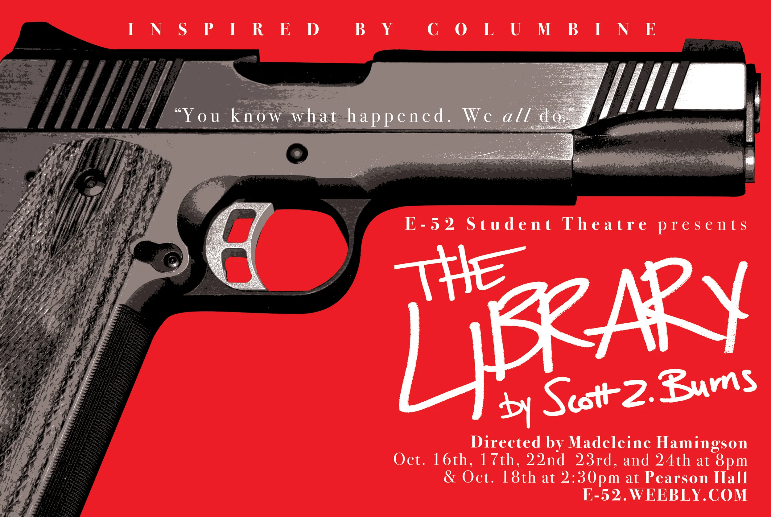 BRIEF: E-52 needs large-scale print and digital promotion for their upcoming play. The Library tells the story of a community shaken after a shooting occurs at their local high school and one of the injured is implicated as an accomplice.